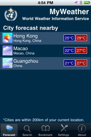 香港天文台推出 My Weather Apps,讓用戶可以更方便地了解世界天氣,用家可以找出香港附近的城市天氣狀況,並接收到未來數天的天氣預測。程式是使 GPS 找出用戶身處的地點,然後再找出附近地城市的天氣。因此,這套 Apps 不一定是香港人才合用,任何地方的人士也合用!