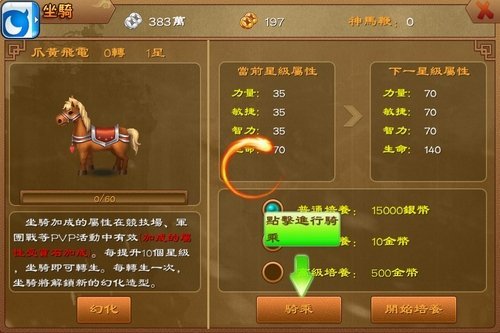 然後就是,多餘的銀幣除了買將,就用在坐騎上,目前鑒定坐騎比裝備強化重要,相對比省錢多,用途廣。座騎的效果是加全軍的屬性,而裝備只是一件一件加,花錢後,升裝備還掉級。