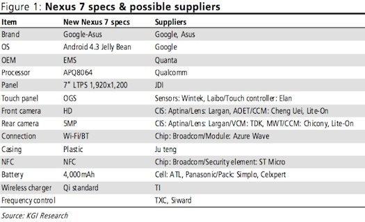 預計第二代 的Nexus 7 定價仍會是 199 美元,仍然會使用 7 吋屏幕設計,但解像度提升為 Full HD (1920 x 1200 16比10螢幕),令PPI 大幅提升,可以減少顆粒感。配備 500 萬像素鏡頭,及 720p 前置鏡頭,電池容量 4,000mAh,比起第一代 Nexus 7 的 4,325mAh 容量較低,內建 Qi 無線充電技術,有機會採用更薄身及幼邊框的設計。處理器提升為 Snapdragon S4 Pro四核心處理器,效能不會有太大提升,因為目標為低價市場,系統搭載最新的 Android 4.3,與早前傳聞的消息一致。