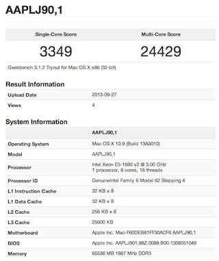 根據消息透露,新一代 Mac Pro 標準配備版的硬件進行跑分測試,軟件為 Geekbench 3,新 Mac Pro 配備 8 核心 Intel Xeon E5-1680 v 2 處理器,跑分為 24429 分,而上一代最強Mac Pro 高配備 12 核心處理器版本,跑分為 25250,可見新一代 Mac Pro 即使是標準配備相近。