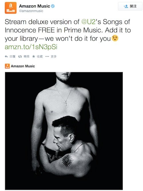 相信不少蘋果用戶,都知道蘋果早前為了向各位宣傳 U2 最新的專輯,可以讓蘋果的用戶免費下載,為此更花掉整整一億美元,但現在 10 月 15日,蘋果最終結束向iTunes 用戶送U2 樂隊的《Songs of Innocence》專輯,近日亞馬遜接手蘋果的免費活動時,亞馬遜公然嘲笑蘋果。