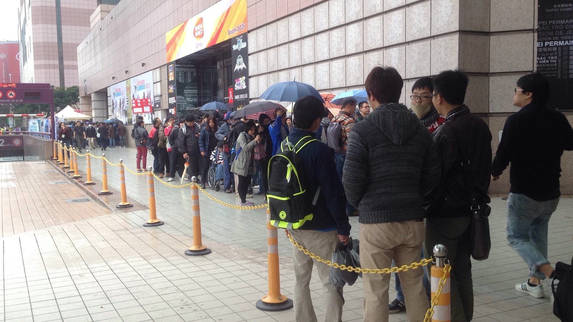 雖然今天台北天公不作美,但是還沒到預定開幕的 10 點鐘,外頭就已經是擠滿了人潮,索性還有時間,我就繞了一圈世貿一館,沒想到只要是有出入口的地方,無一不是人山人海。但是既然天氣不佳,通往室外的入口還是比較少人,所以我就找了個排隊人潮最短的。到了 10 點鐘,人潮便開始騷動起來。