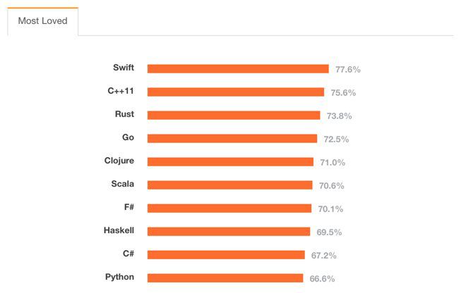 問答服務網站「StackOverflow」進行一次調查,針對全世界157個國家的2.6萬名開發者,6800 人是全職軟件開發人員,,結果顯示,蘋果的 Swift 語言以 77.6% 成為目前最受歡迎的開發語言,超越推出多年的 C++。