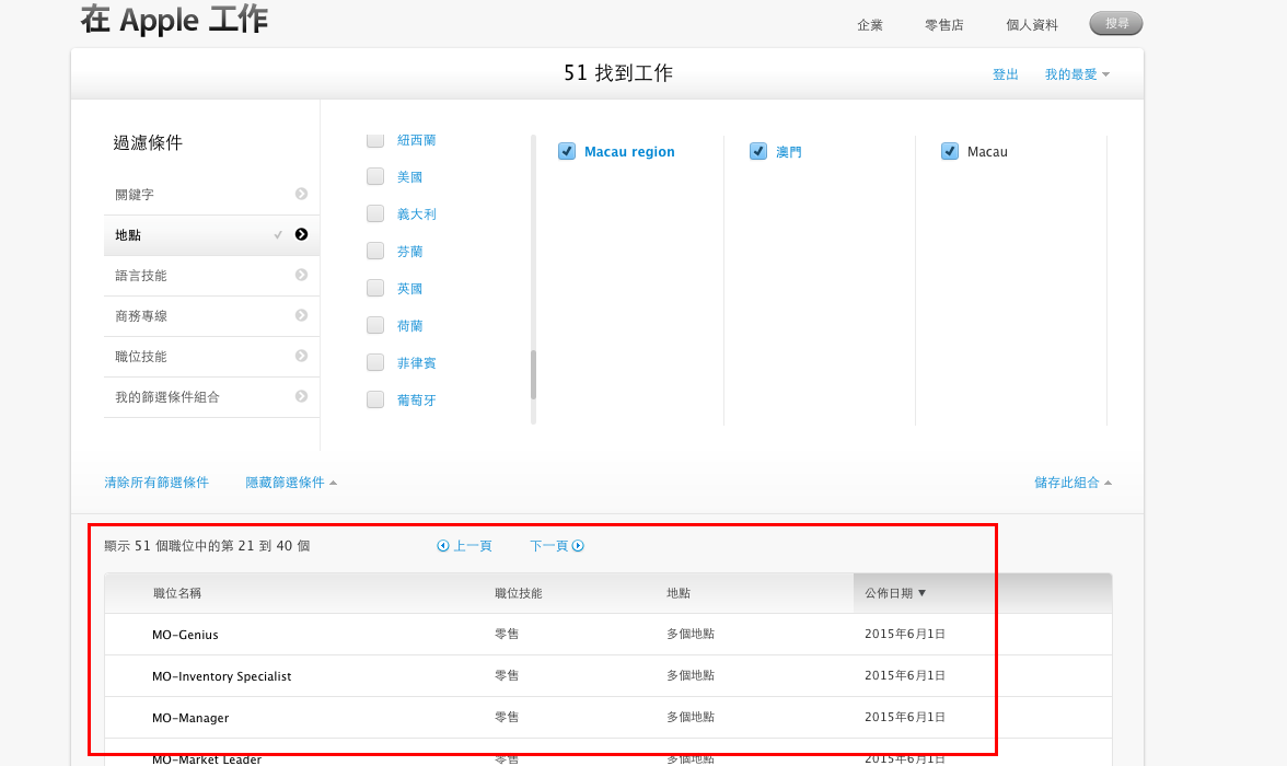 不止臺灣,現在連澳門也傳出會開設 Apple Store 的消息。從蘋果招聘網站可以搜尋到,蘋果在澳門聘請只有 Apple Store 才有的 Expert、Genius 等等職位,雖然上班地點是「多個地點」,但蘋果在今日開始專誠在澳門開始聘請零售店專用員工,意味著澳門開設首間 Apple Store 的時間不再是遙遠的事。至於在那裡開設以及何時開幕,仍然未知之數,但相信要開的話,離不開路氹城或澳門較大的商場或賭場,吸引賭客購買。