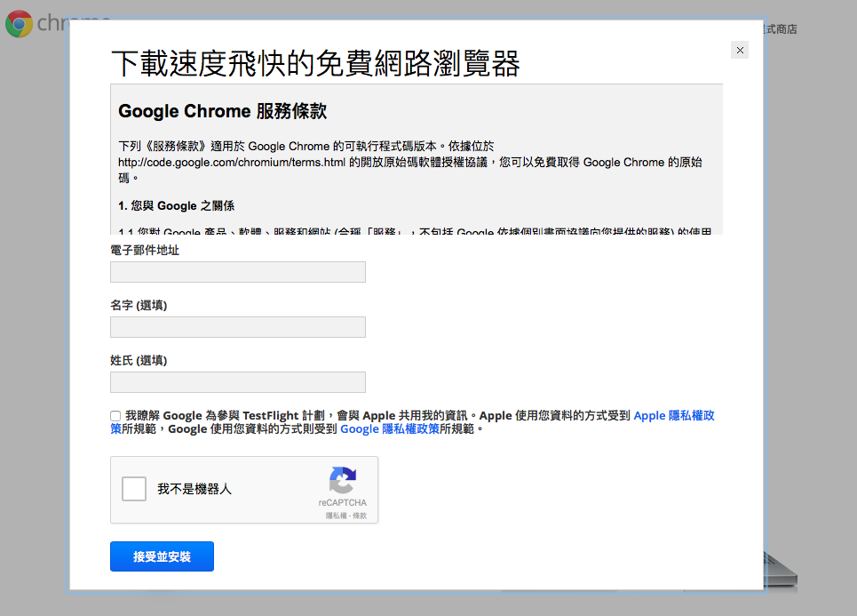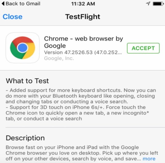 ▼然後前往 Google Chrome Beta 版網頁填寫下載 iOS Beta 版的同意書!www▼點擊最低一行的 iOS 版,上圖中顯示藍色的 iOS 字樣!填寫同意書後會收到電郵通知,之後就可以在 TestFlight 下載 Chrome for iOS Beta!ppp最新測試版本為 Chrome 47.2526.53chrome-beta-ios-