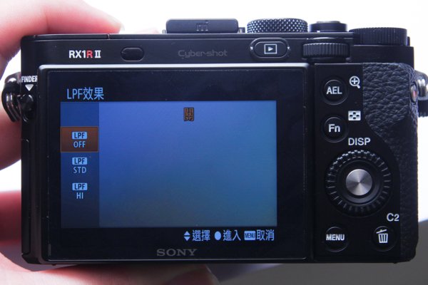 RX1R II 的低通濾鏡結合光學與電子技術,在低通濾鏡中加入一層可經電壓調節的液晶層,當關閉低通濾鏡時,光線會更直接進入 CMOS ,由於光線沒有衍射,所以相片成像銳利度高。當開啟低通濾鏡時,液晶層就會運作,就如一般數碼相機般,光線經過低通濾鏡而出現衍射,但就可以降低呈水波的摩爾紋。這功能分成分「高」、「標準」及「關」三個選項。另有包圍拍攝模式,相機會以低通濾鏡的「高」、「標準」及「關」三個設定快速各拍一張,令後製有更大空間。