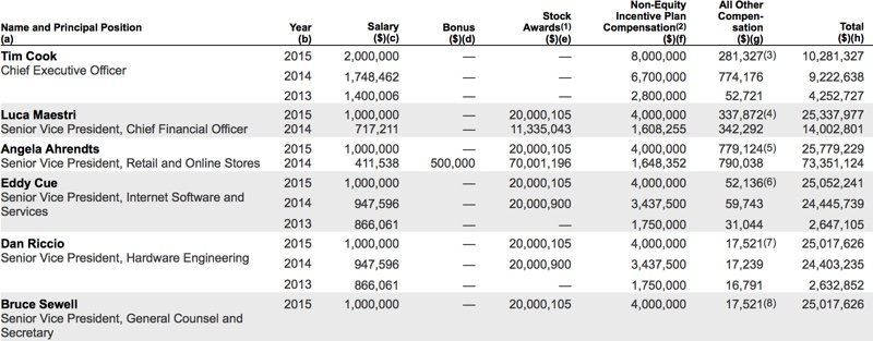 但其實高收入的大有人在,Apple 零售主管 Angela Ahrendts 在 2014 年的薪酬更曾達到了 7,335 萬美元,不過由於股份獎勵的問題,在今年與大多數高管持平為 2,800 萬美元!SEC 的報告還顯示了 Bruce Sewell,Dan Riccio,Eddy Cue 和 Luca Maestri 的收入數據!