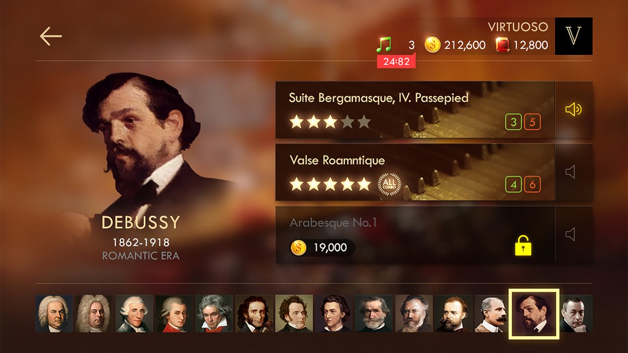 這款《Pianista》內收錄了 14 位大師作曲家的經典音樂,在玩法上其實就和大多數的節奏遊戲差不多,且構造上也偏向簡單化,方便玩家遊玩。