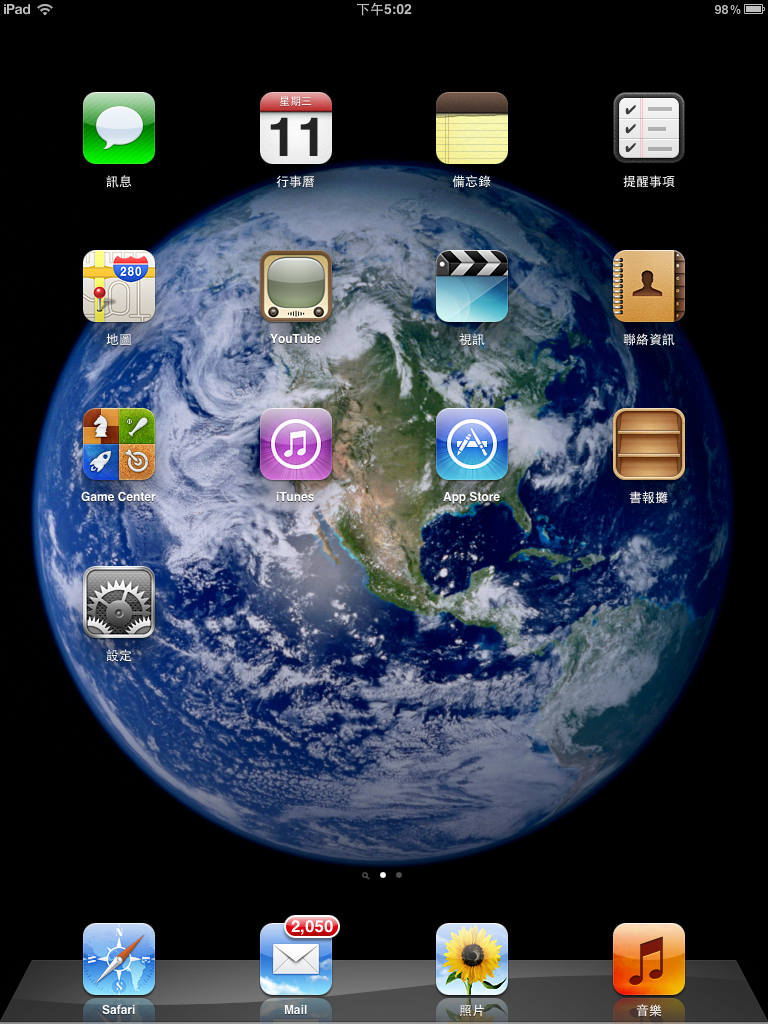因為 iPad 安裝的 iOS 5.1.1,打開的預設應用程式介面較接近一般用戶開始接觸 iPhone 或 iPad 時候的樣子。在 iOS 7 重新設計應用程式介面之前,iOS 是以日常生活的物件去設計,這個風格以 iPad 更明顯。行事曆以日曆樣子設計、備忘錄以 Memo 紙設計、YouTube 較像電視機、書報攤真的像書櫃般拉出。小編未擁有 iPhone 之前使用過安裝 iOS 6 的 iPhone 3GS,看到初代 iPad 的 App 介面十分懷念。