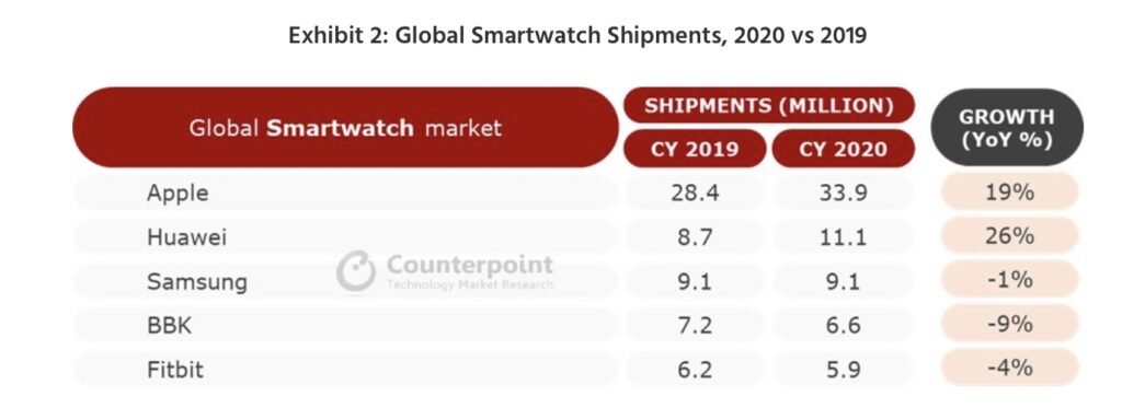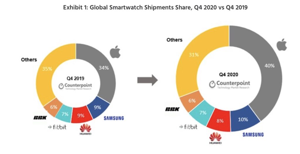 來自市場研究公司 Counterpoint Research 的調查,全球智能手錶出貨量於去年第 4 季按年增長 1.5%。當中 Apple 在合有 1290 萬隻 Apple Watch Series 6 及 Apple Watch SE 出貨,成為全球出貨量最高的智能手錶。