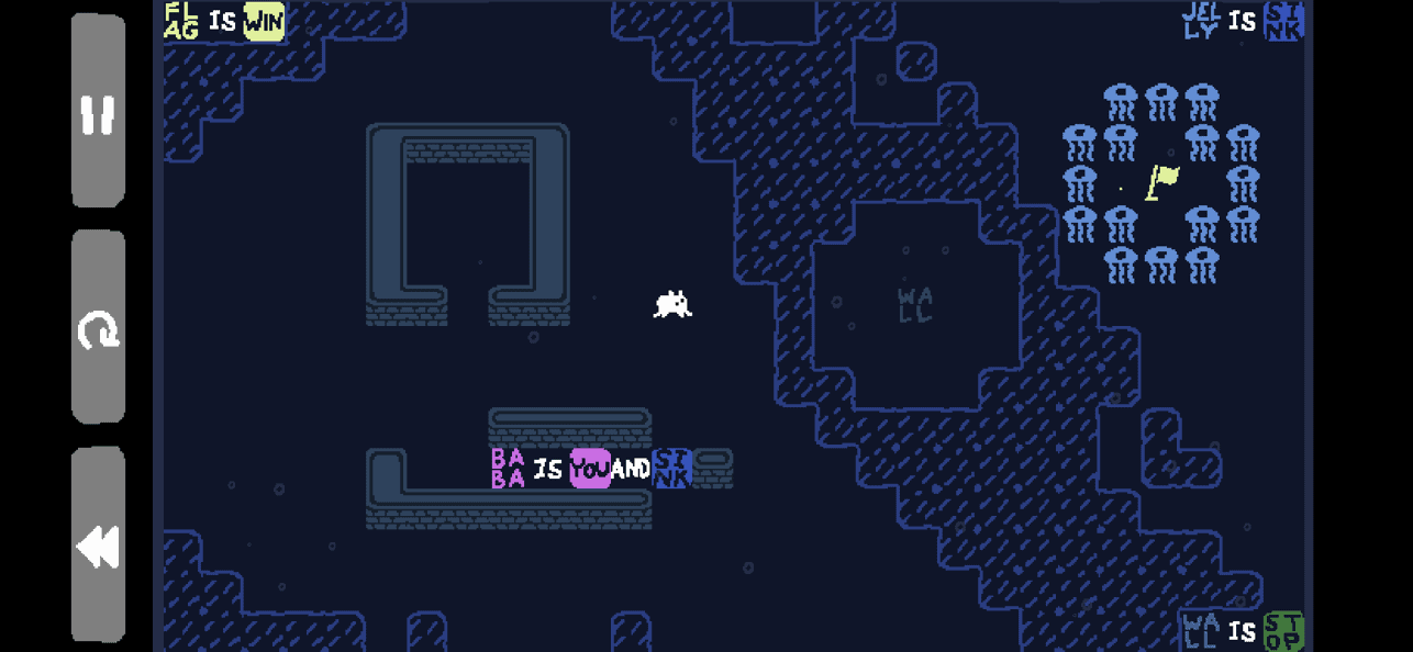 那要如何過關呢?這就得竄改每個關卡裡的「規則」了,遊戲中的規則都會寫在關卡中,但這些規則的排列是可以更動的,藉由更動規則,你甚至可以讓 Baba 變成其他東西、讓終點隨處可見、讓障礙物不再有阻擋能力,至於要如何過關?就得依靠你的邏輯與想像力了。