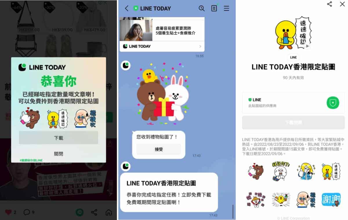 2:完成任務後,系統會自動發送訊息到聊天室的LINE TODAY官方帳號,大家根據指示即可免費下載及使用貼圖。