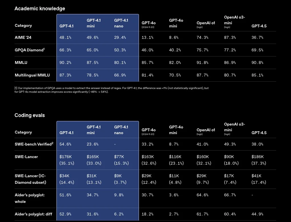 除了 GPT-4.1 外,OpenAI 同步推出兩款輕量版模型:GPT-4.1 Mini 與 GPT-4.1 Nano。Mini 延續前代設計,為開發者提供更經濟實惠的選擇,而 Nano 則為 OpenAI 迄今為止「最小、最快、最便宜」的人工智能模型,特別適合需要快速回應與低成本部署的場景。三款模型均支援相同的百萬 token 上下文長度,顯示 OpenAI 對運算優化的深厚實力。